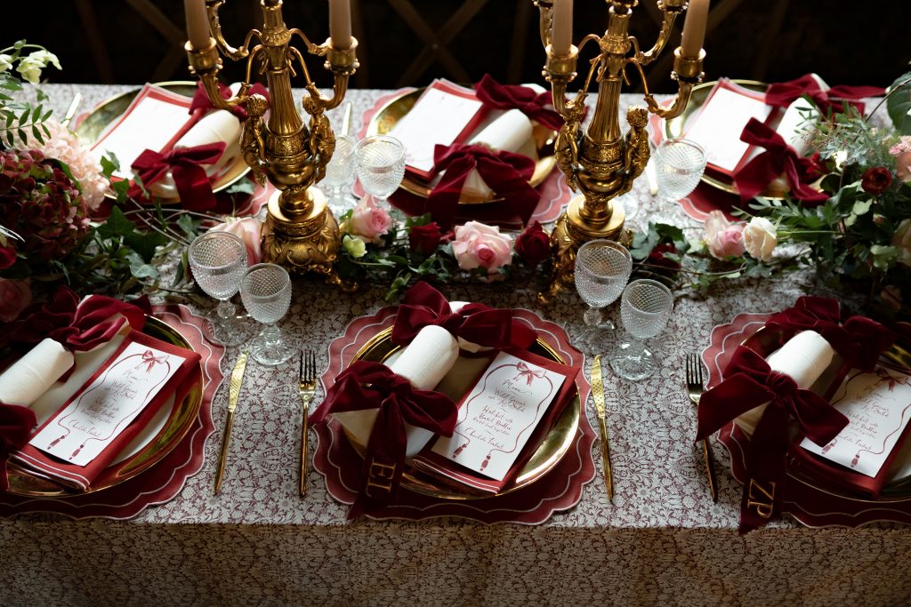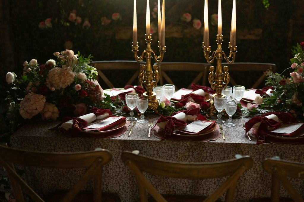 Photographed by Rebecca Searle Photography and styled by Alice Wilkes Design; with a red gold and muted pink colour scheme it’s perfect to release those traditional vibes round the dining table. Vintage style glassware and gold cutlery and candlesticks add an opulent luxury feel and the beautiful Liberty London print tablecloth adds a chintzy touch.