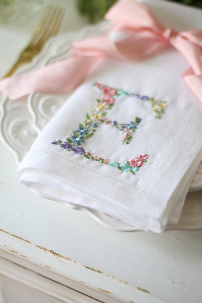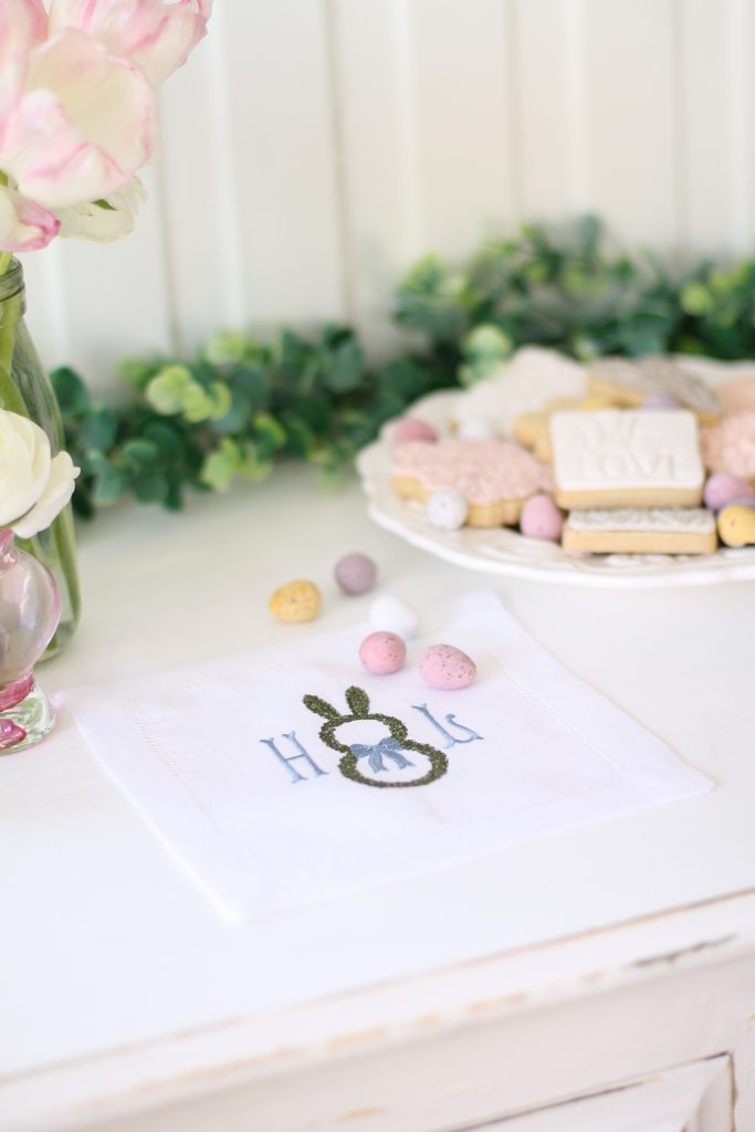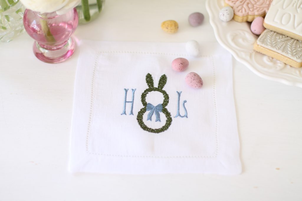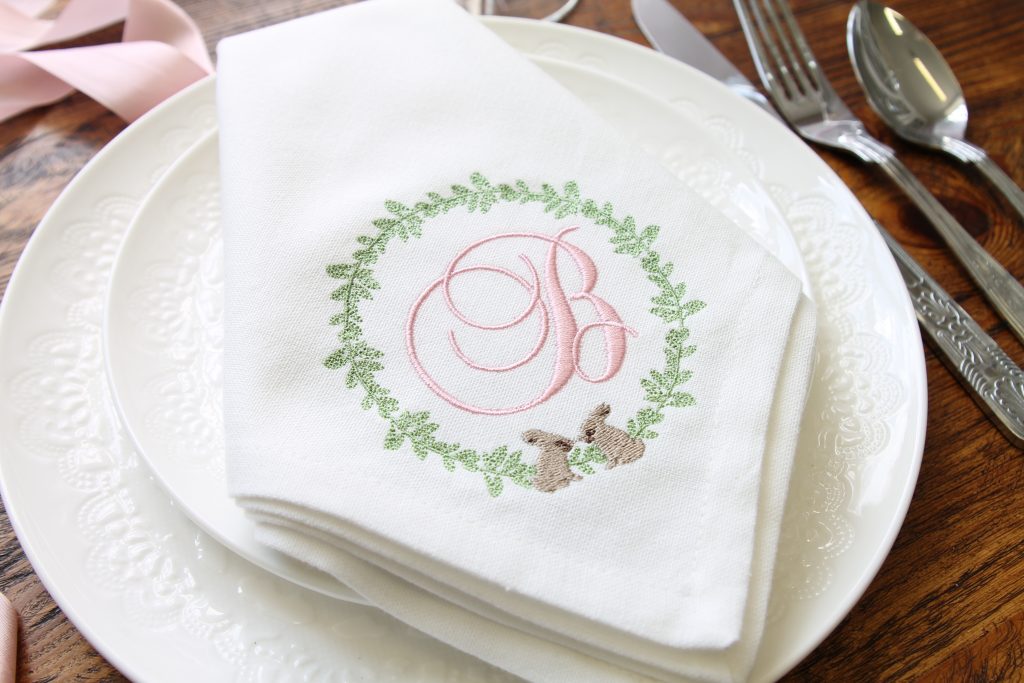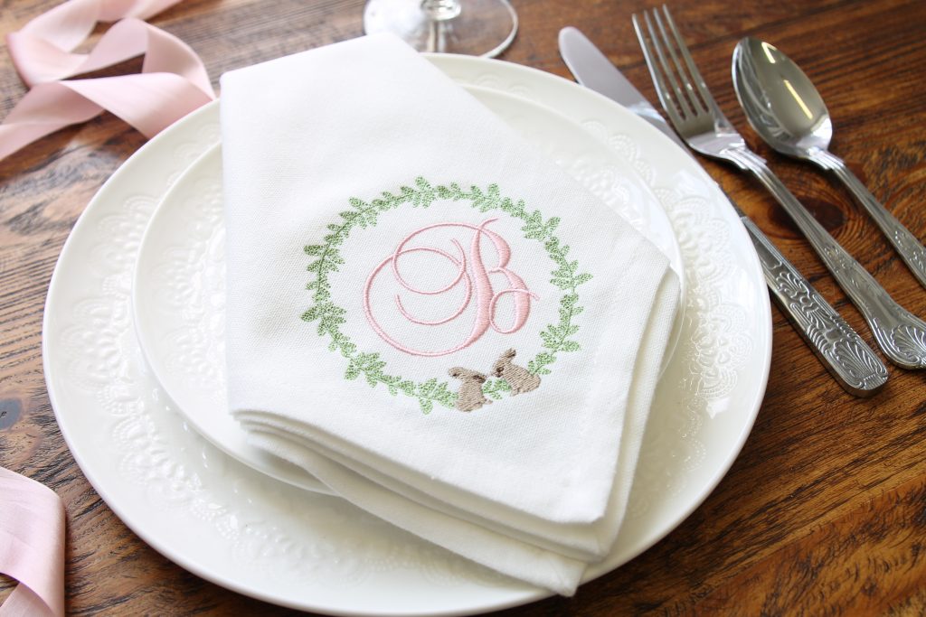 Our Easter monogram napkins are perfect for a simple tablescape. They work well with one initial, which could be your family surname or the first letter from each person’s name. They definitely create a unique place setting idea for Easter! This cute design also comes in a matching cocktail napkin.