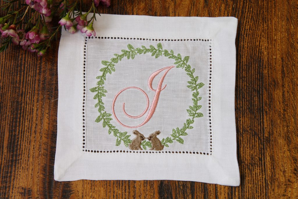 Our main cocktail napkin range comes in multiple designs the beautiful Easter bunny and butterfly monogram napkin with double initial, is versatile and super cute and you can choose your own embroidery colour for the bunny & initials, and the butterfly. Our Easter bunny cocktail napkin has a cute bunny with a little bow and a double monogram with each initial on either side of the bunny.