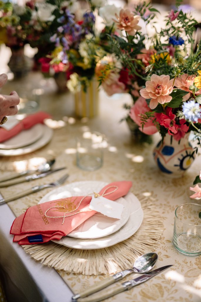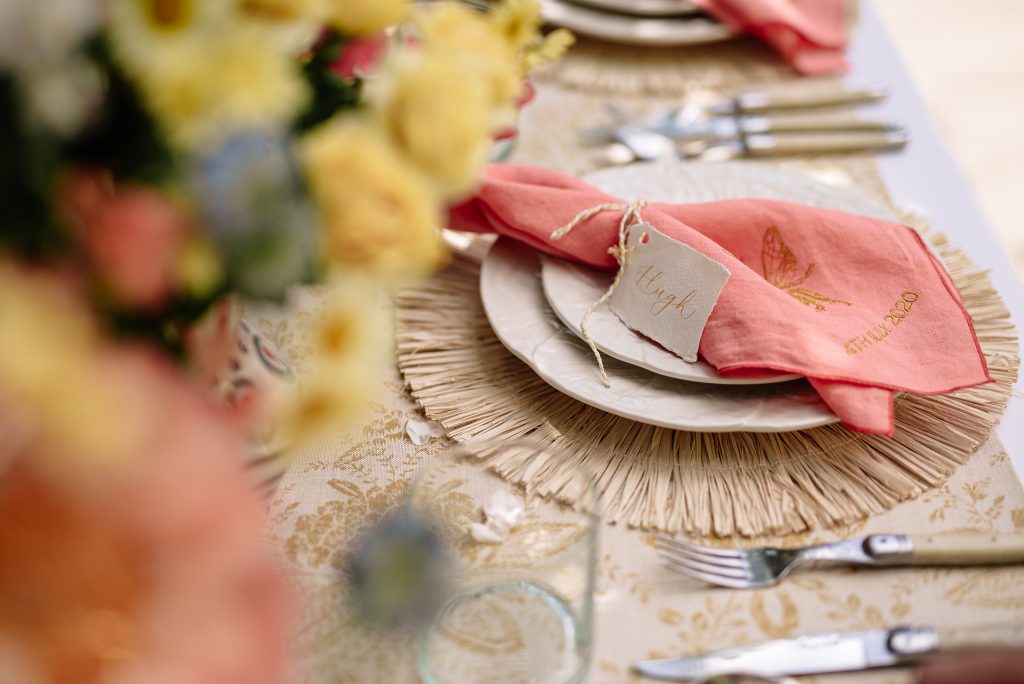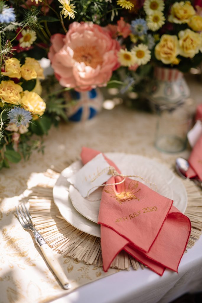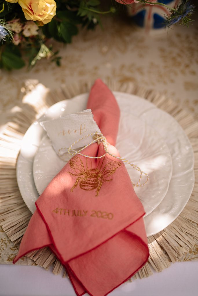 We created personalised pink napkins with a gold embroidered bee monogram which we completed with the date of the ceremony. If a monogram isn’t your thing, these napkins can also have initials embroidered in a beautiful, contemporary, hand calligraphy style font. You can choose a single initial, two or three initials, and there is a choice of embroidery colours .