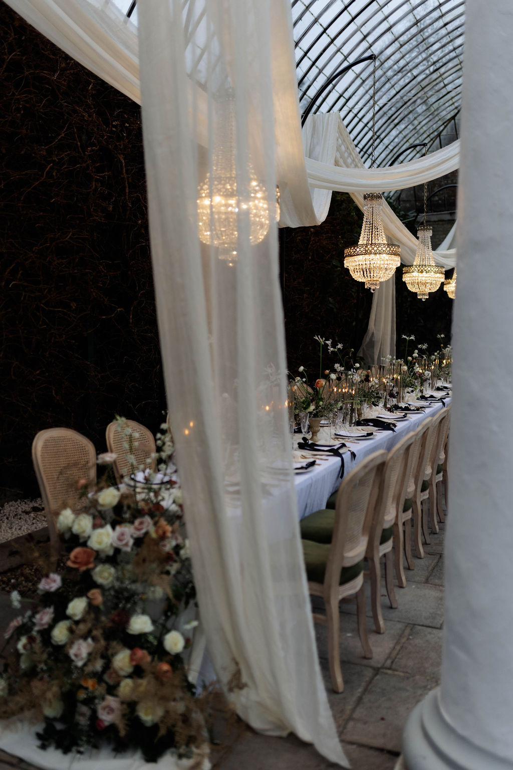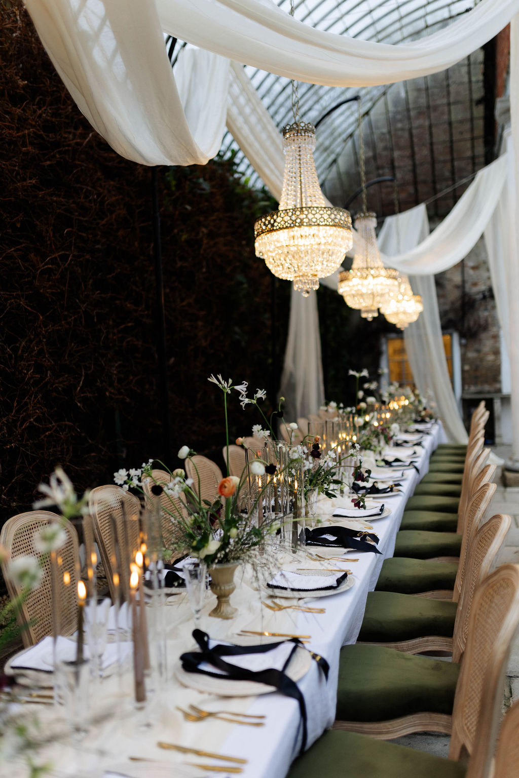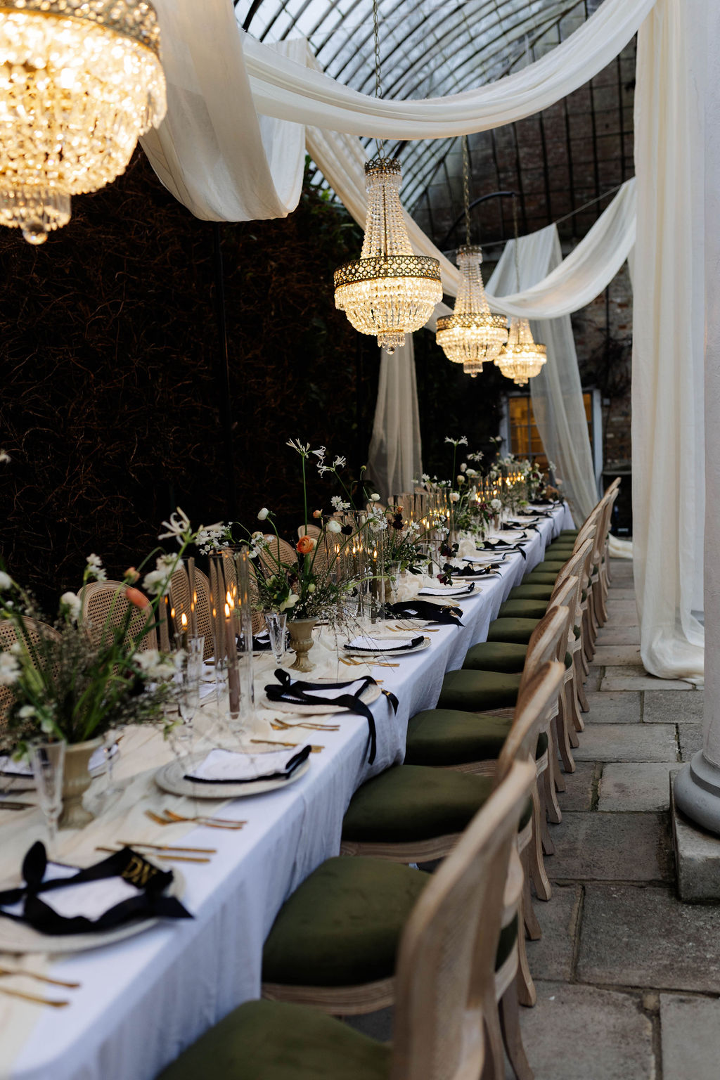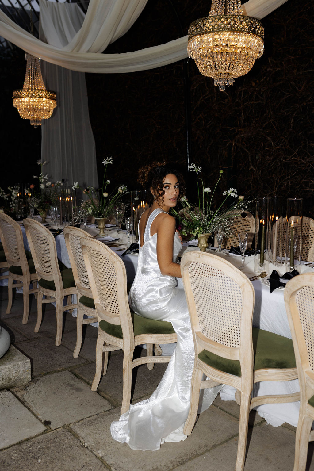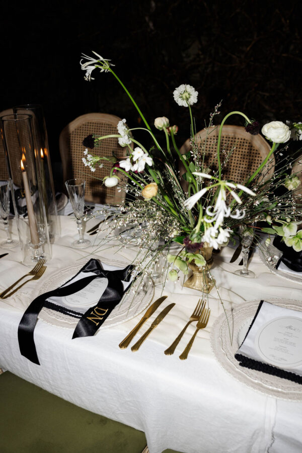 Styled against a backdrop of crisp white linens, olive accents, antique gold cutlery, and sculptural florals, this aesthetic is a masterclass in understated opulence. Minimalist menus and delicate glassware complete the design, allowing the textures and thoughtful details to take centre stage.