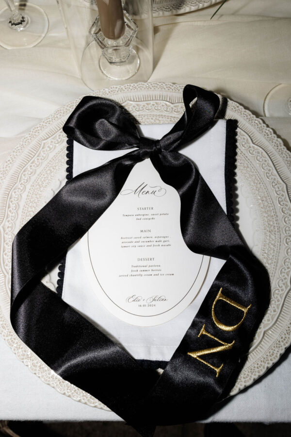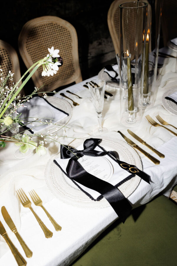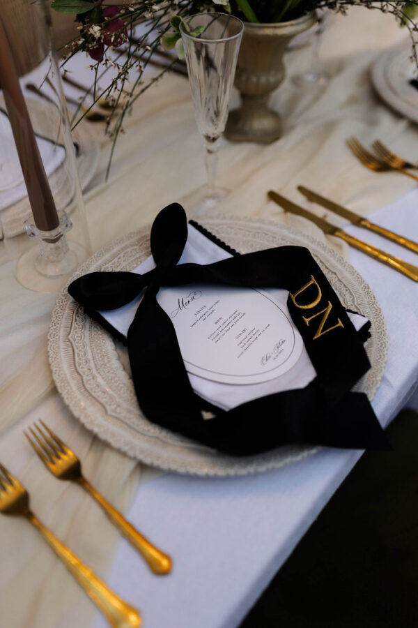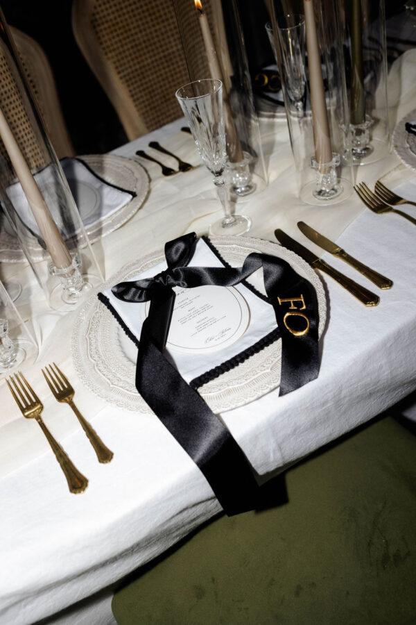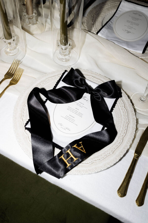 At the heart of this look are our embroidered satin ribbon bows—crafted from luxurious double-sided satin and embroidered in metallic gold with each guest’s initials. Draped effortlessly across place settings and tied into elegant bows, they bring a bespoke, couture finish to your tablescape, creating a personal moment of luxury for every guest.