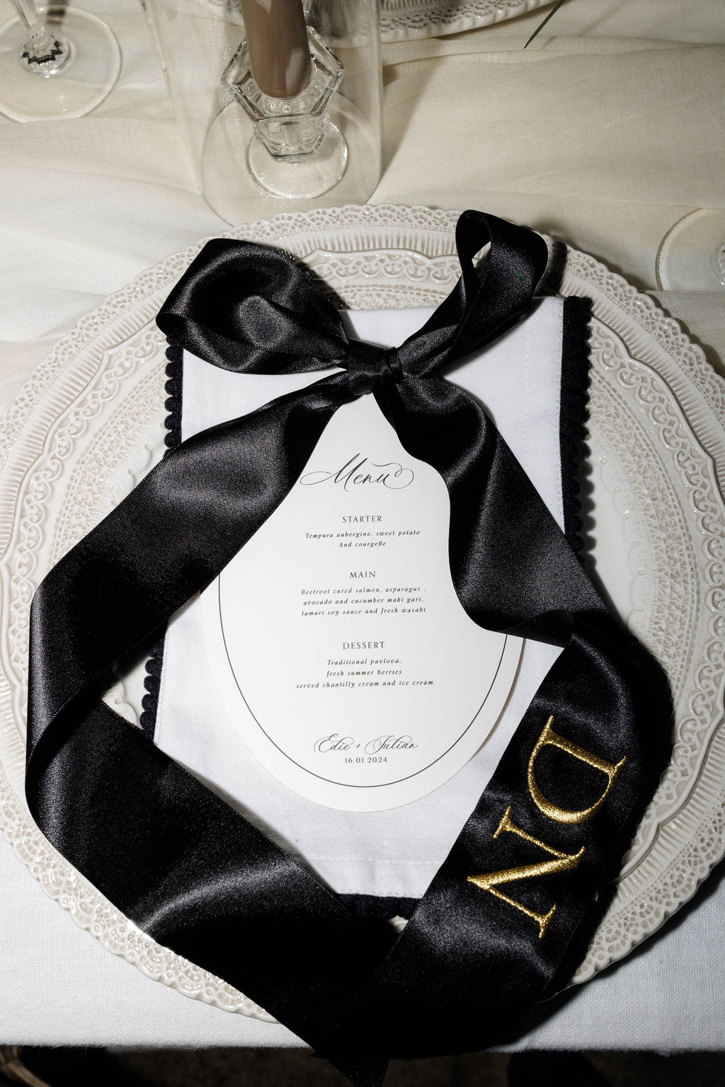 Our high-quality, double-sided satin ribbon is designed to tie into an elegant bow, expertly embroidered with your guest’s name in the thread colour of your choice. A personalised embroidered satin ribbon bow is the ultimate finishing touch—bringing a bespoke, fashion-forward feel to your wedding table decor.