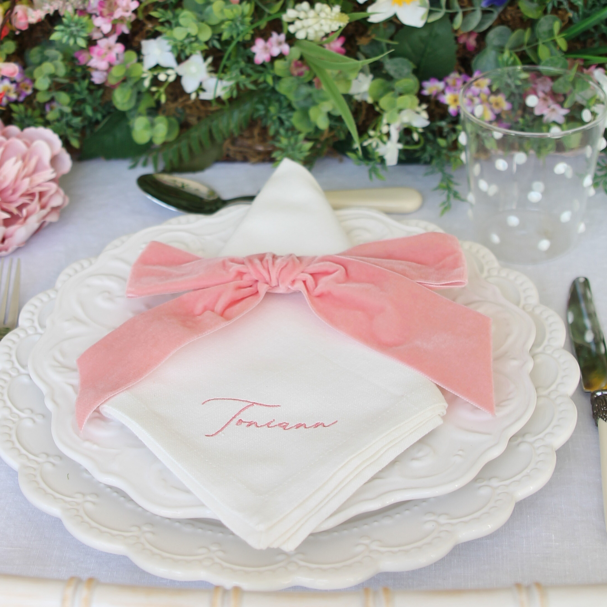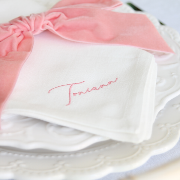 Napkins with names on them make a unique place setting. Your guests will adore the extra details of a personalised napkin, and many will take them home as a memento of your wedding day or special occasion. We have a choice of font styles and embroidery colours, so we can match your theme and palette perfectly.