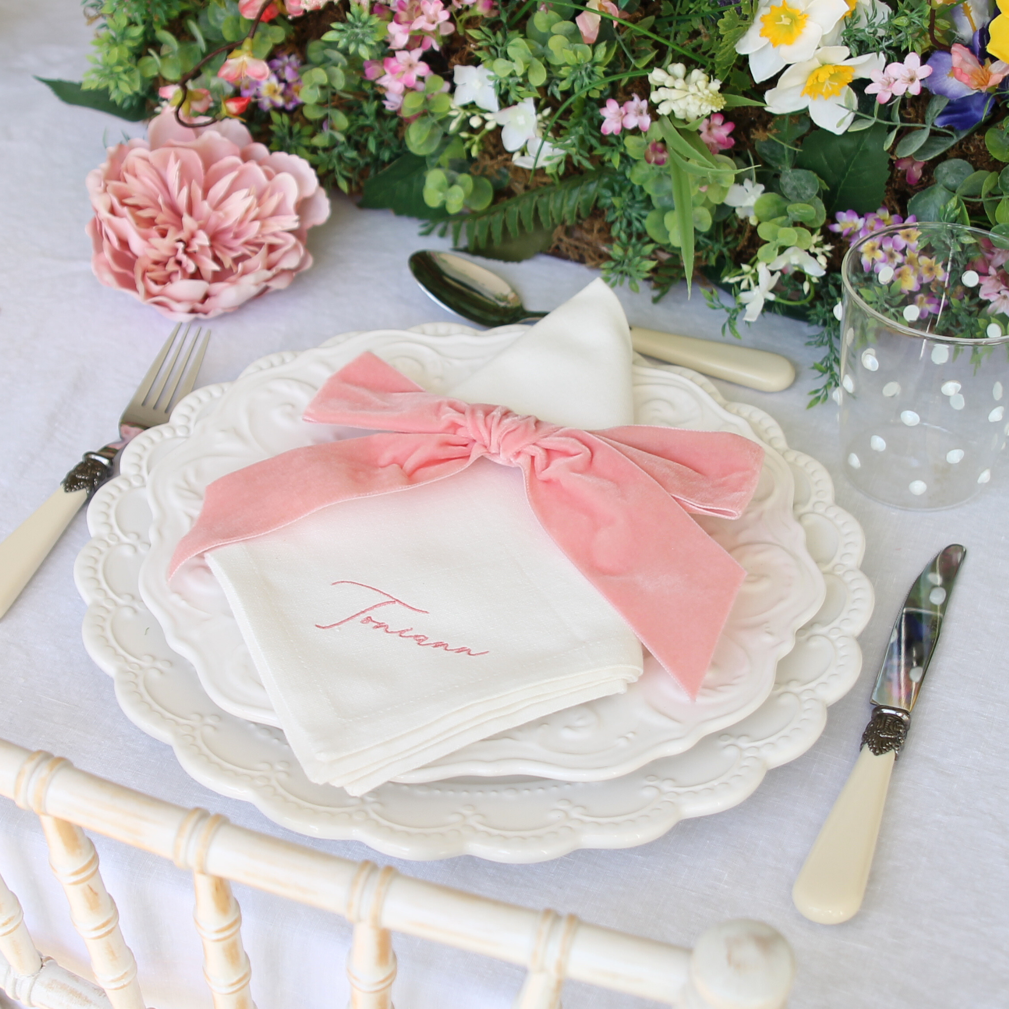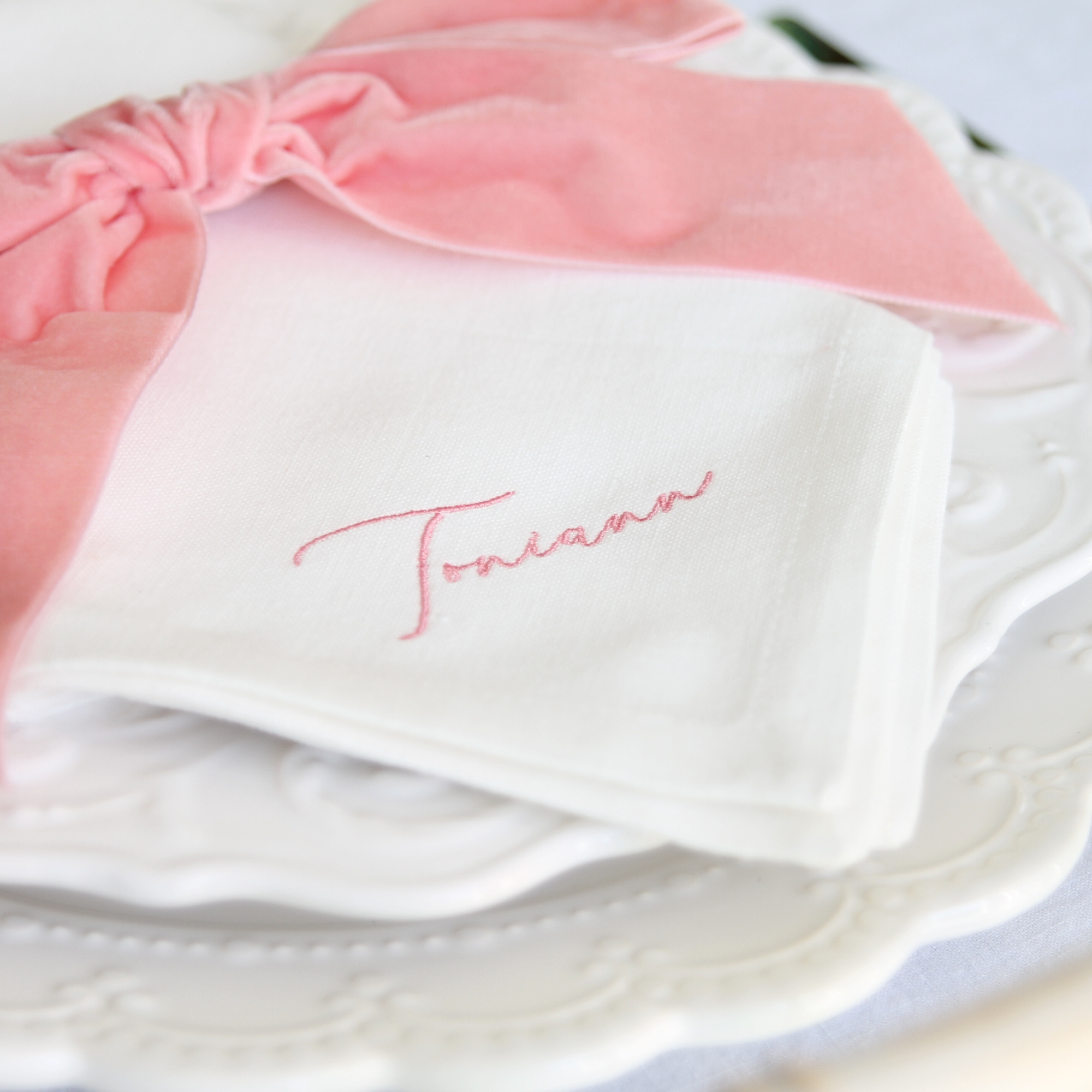 Our plain cotton napkins are approx 45cm square, and the fabric is woven to have a textured look of natural linen. The napkins are available in Porcelain, which is a beautiful ivory shade, and a choice of embroidery colours. Your embroidery will be positioned diagonally on the lower right corner of the napkin.