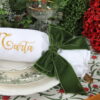 Personalised fabric cracker in white linen is elegantly embroidered with a single name, featuring a festive, ornate first letter. Finished with luxurious green velvet triple bows, each cracker includes a cardboard barrel inside, perfect for adding your own small gift or chocolates, making it a delightful addition to your Christmas table.
